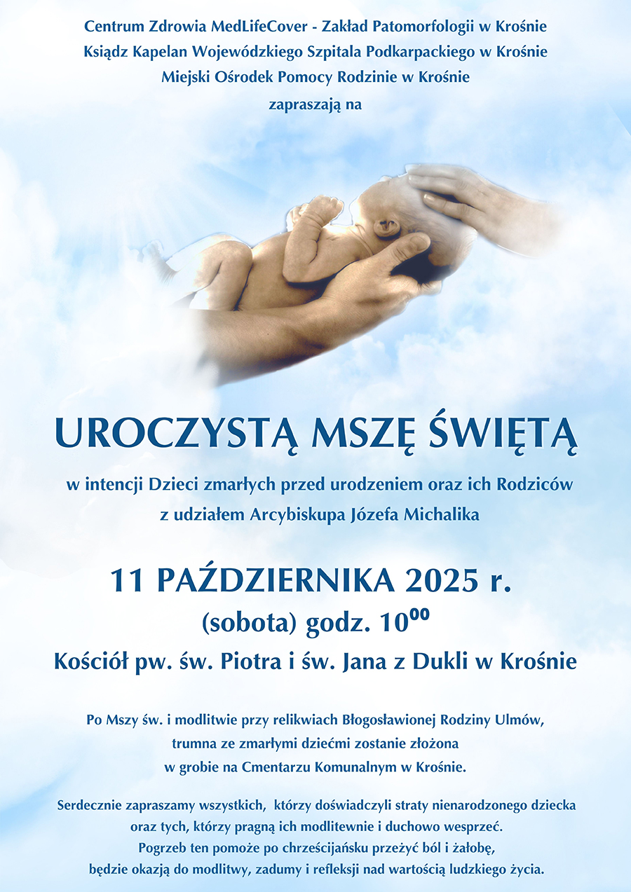 Ksiądz Kapelan Wojewódzkiego Szpitala Podkarpackiego im. Jana Pawła II w Krośnie, Centrum Zdrowia MedLife Cover – Zakład Patomorfologii w Krośnie oraz Miejski Ośrodek Pomocy Rodzinie w Krośnie zapraszają na uroczystą Mszę Świętą w intencji dzieci zmarłych przed narodzeniem oraz ich rodziców.