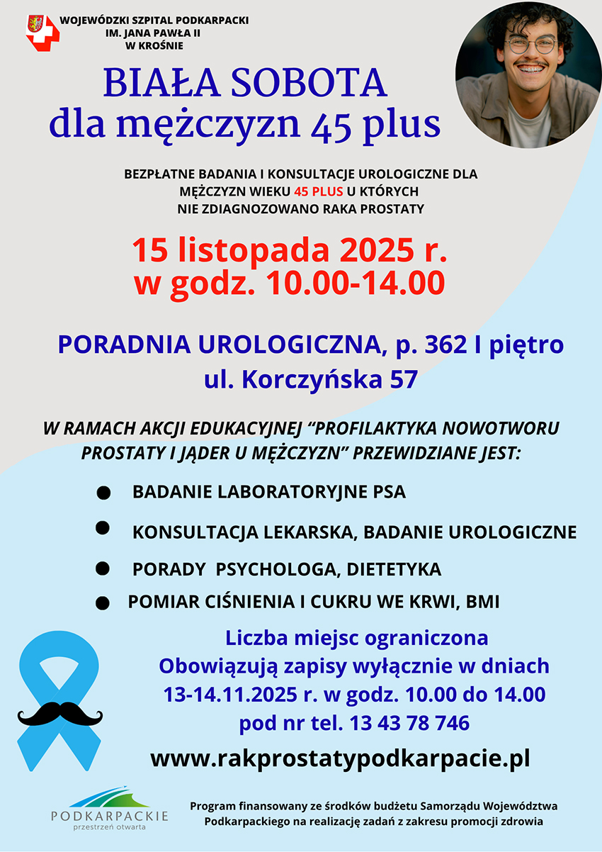 Wojewódzki Szpital Podkarpacki im. Jana Pawła II w Krośnie zaprasza mężczyzn w wieku 45 lat i więcej, u których nie zdiagnozowano raka prostaty, na akcję profilaktyczną „Biała Sobota dla mężczyzn 45 plus”.
